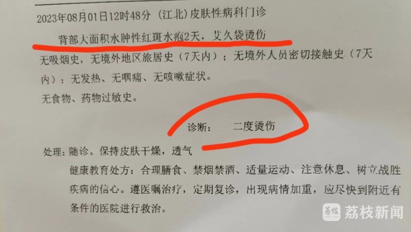 7月31号,市民白女士在一家私人的米兰米雪美容院做背时背烫伤,起了血泡和水泡,发红水肿。第二天去江北鼓楼医院就诊,诊断为二度烫伤。