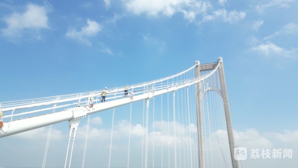8月3日,在南京栖霞山长江大桥上, 南京市交通集团所属公路集团桥梁养护工程师 程树铭和同事一起穿戴好安全装备,就顺着大桥下游主缆的底部往主缆上端攀爬。