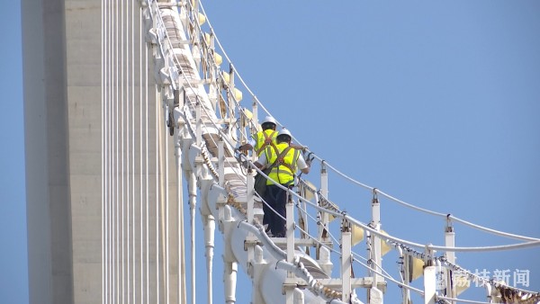 程树铭和同事沿着直径约80厘米的主缆往上攀爬,每隔一段距离就要停下来,用相关仪器对螺杆进行检测。程树铭说:“栖霞山长江大桥全桥一共有3060根索加螺杆,我们每年会抽取近204根螺杆进行一个跟踪观测。我们会从主缆的最低点一直到达我们的主缆全缆,最高点距离桥面大概160多米。最早开始还是会有紧张的,但是后面为了做好养护管理工作,我们攀爬主缆的次数其实也是慢慢增多,到后面就已经轻车熟路了。”