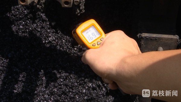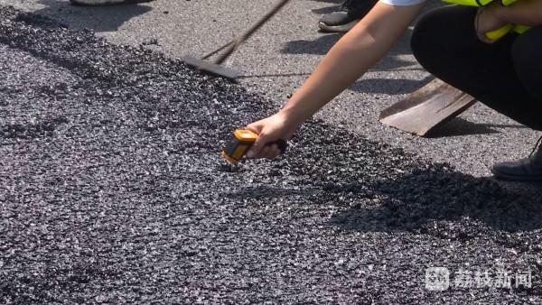 除了像程树铭这样的桥梁养护工程师外,需要在高温环境下作业的还有道路养护工程师。8月3日11:10,在南京绕越高速公路上,南京市交通集团所属公路集团道路养护工程师柳富勇正拿着温度计和深度测量工具在一处沥青摊铺现场来回走动。