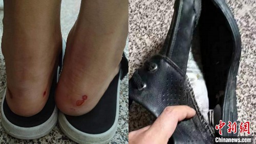 泡烂的皮鞋、脚上尚未痊愈的水泡伤口。 受访者供图。