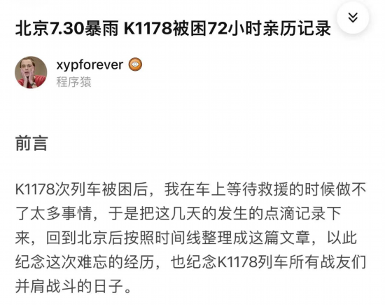 K1178次列车乘客谢先生(网名xypforever)用文字记录下被困的72个小时,这篇文章登上平台热榜,受到众多网友的关注。谢先生告诉总台记者,“这是一段难忘的经历,面对突如其来的险情,中国人就是这样齐心协力、同舟共济!”