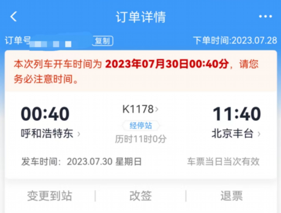 于是,我锁定了半夜12点左右从呼和浩特到北京的车,23时59分发车的K396、0时29分发车的Z180、0时40分发车的K1178,好巧不巧,这也正好是本次被困的三趟列车。当时K396、Z180没有卧铺票了,所以我买了K1178的卧铺。晚上演唱会结束后,我直奔呼和浩特东站,随身只带了一瓶水,登上了K1178。