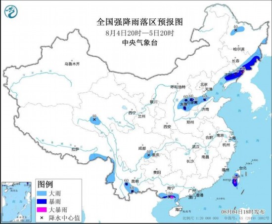 中央气象台8月4日18时继续发布暴雨蓝色预警:预计,8月4日20时至5日20时,黑龙江西北部和东南部、吉林东部、辽宁中东部、山西中部、河北南部、山东北部、广西南部、广东西南部、云南西部和南部、青海南部、台湾岛等地的部分地区有大到暴雨,其中,吉林东南部、辽宁东部、广西东南部沿海、台湾岛中部等地局地有大暴雨(100~160毫米)。上述部分地区伴有短时强降水(最大小时降雨量30~60毫米,局地可超过70毫米),局地伴有冰雹、雷暴大风等强对流天气。