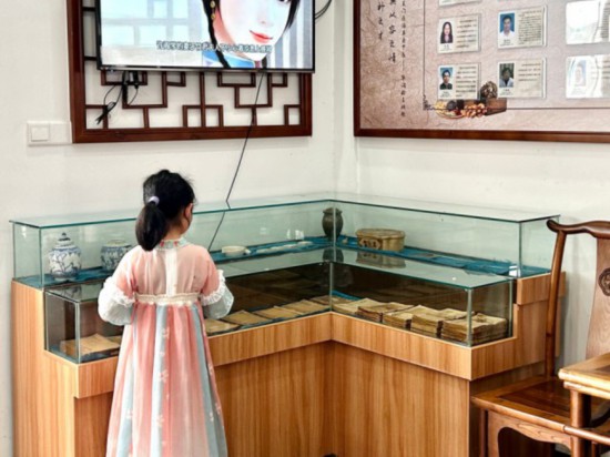 在苏州市吴江区同里镇卫生院中医馆的中医药健康文化知识角,收藏有清代名医徐大椿的典籍专著,一位小患者正在认真观看陈列柜中的展品。刘静怡 摄