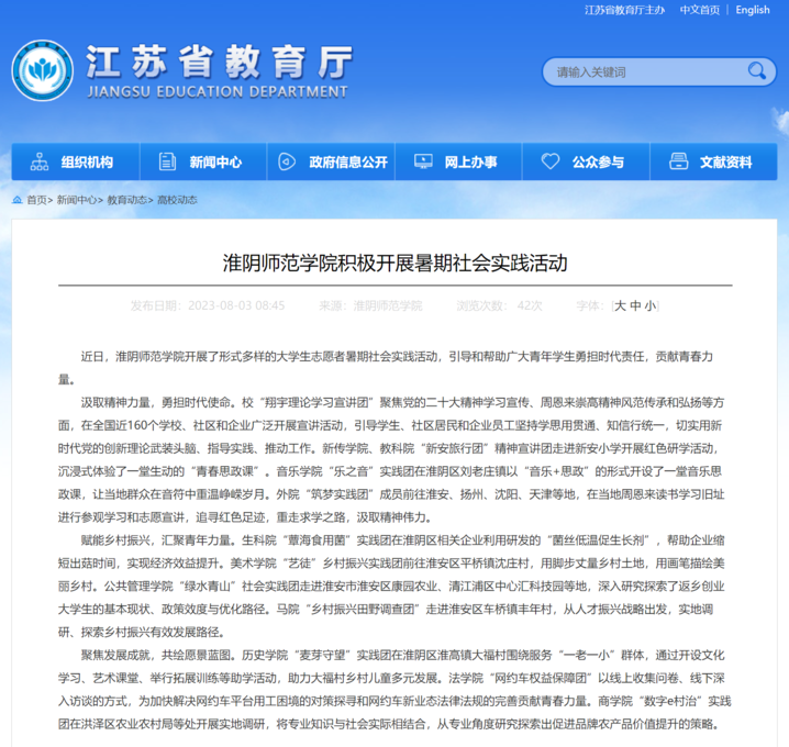 近日,淮阴师范学院开展了形式多样的大学生志愿者暑期社会实践活动,引导和帮助广大青年学生勇担时代责任,贡献青春力量。