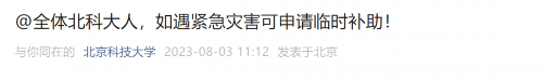 北京科技大学表示,无论是即将报到的新生,还是其他年级的同学,如果家中遭受自然灾害,导致家庭重大财产损失,出现经济临时性困难,可以第一时间联系学院辅导员,向学院说明情况,经由学院向学生资助管理中心提交临时特殊困难补助申请表。