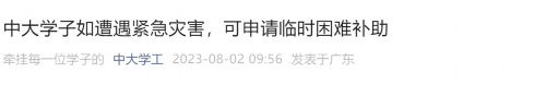 中山大学表示,学校针对学生及其家庭因病/因灾/因重大变故产生的,常规资助方式无法解决的临时困难,设置临时关爱补贴。
