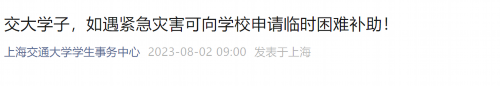 上海交通大学表示,学校临时困难补助通道随时开放,如学生及学生的家庭遇到各类紧急灾害、突发事件(不限于台风灾害),可第一时间将情况告知您所在院系的思政教师、辅导员,同时可向学校申请临时困难补助。