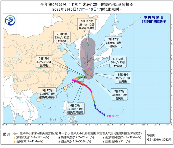 △最新路径预报显示,“卡努”明天上午移出东海,未来向日本九州岛南部一带沿海靠近。