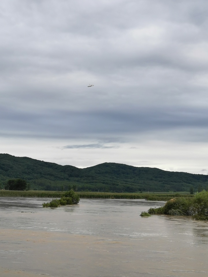 黑龙江五常市向阳镇与吉林省舒兰市金马镇(图中对岸)隔河相邻,正在修建的大桥左侧原本有座便桥,现已被洪水淹没,状况不明