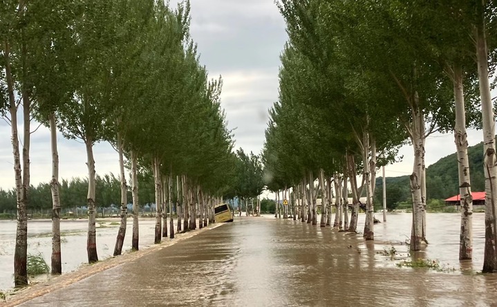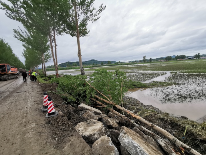 在165县道蛤拉河村和鲜族屯附近,原本在路东侧山底流淌的拉林河,因水势较大,已漫过165县道涌进西侧的哈拉河村及周边农田,整个川道平地几乎都被淹没。有一处路段半幅坍塌,出现十余米的缺口,救援力量正在抢修。一辆运送救援人员的公交车也被冲出路面,歪倒在路边大树上。