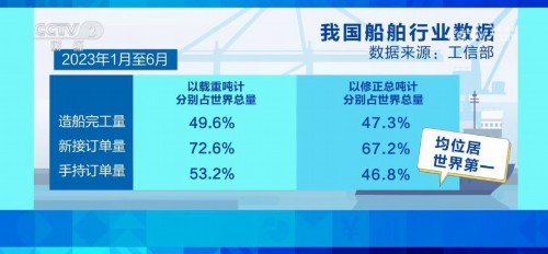 工业和信息化部数据显示,2023年1月—6月,我国造船完工量、新接订单量和手持订单量,以载重吨计分别占世界总量的49.6%、72.6%和53.2%,以修正总吨计分别占47.3%、67.2%和46.8%,均位居世界第一。
