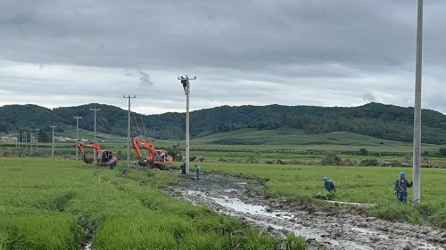 国家电网吉林供电公司工作人员正在紧急恢复舒兰市受灾区域供电