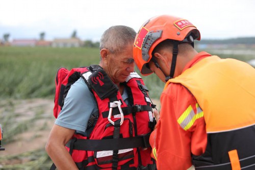 8月4日,吉林省吉林市森林消防支队的消防救援人员在舒兰市七里乡转移受灾群众。薛二涛摄