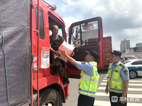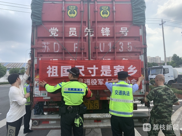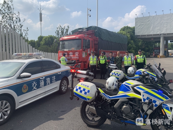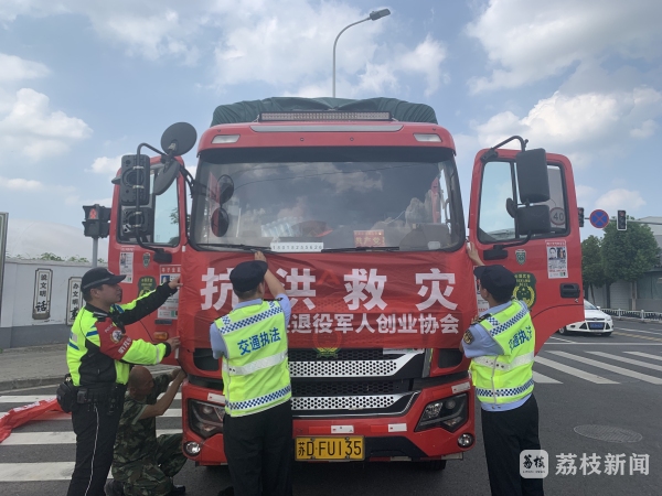 8月6日下午,交通执法四大队执法人员首先帮助刘永振整理好救援物资,接着又联合钟楼交警大队护送救援货车到邹区高速出口,为刘永振同志运送防汛应急物资前往抗灾一线保驾护航。阳光下,救援货车车身上的“抗洪救灾,祖国尺寸是家乡”的红色标语格外显眼。