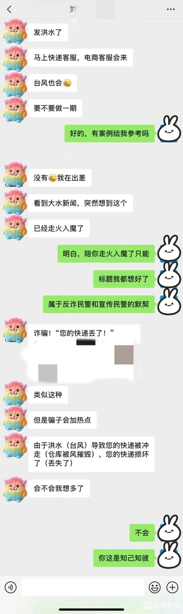 今天(8月7日),记者从镇江丹阳市公安局了解到,反诈民警向宣传民警发来微信:“发洪水、刮台风,马上快递客服、电商客服会来。”宣传民警秒懂此“快递客服、电商客服”并非真正的客服:“明白!”
