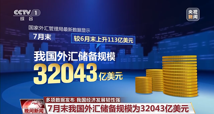 国家外汇管理局最新数据显示,7月末,我国外汇储备规模为32043亿美元,较6月末上升113亿美元,升幅为0.35%。我国外汇储备连续两个月上升,规模保持基本稳定。