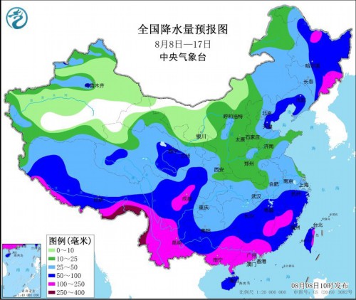 未来10天(8月8日-17日),主雨区位于东北、西北地区东部、华北东部、江南大部、西南地区东部、华南及青藏高原东部和南部等地,大部地区累计降水量有60~80毫米,部分地区有100~180毫米,华南西部、云南南部和西部以及西藏南部局地超过200毫米;上述大部地区降水量较常年同期偏多2~5成,局地偏多1~2倍;华北大部、黄淮及江淮等地大部降水偏少。