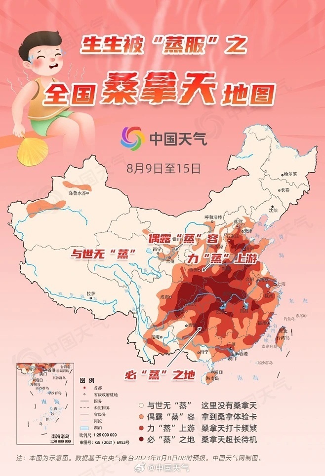 今天(8月8日)进入立秋节气,不过对于我国大部而言,立秋并不等于入秋,不少地方依然“上蒸下煮”,可谓是“秋已立,暑难消”。预计明天至15日,四川盆地、江汉、江南北部、黄淮等地共10余省份将现桑拿闷热天,闷热停不下来;华北、西北等地部分地区也会偶露“蒸”容,拿到桑拿体验卡。@中国天气 推出全国桑拿天地图,看看哪里将生生被“蒸服”。