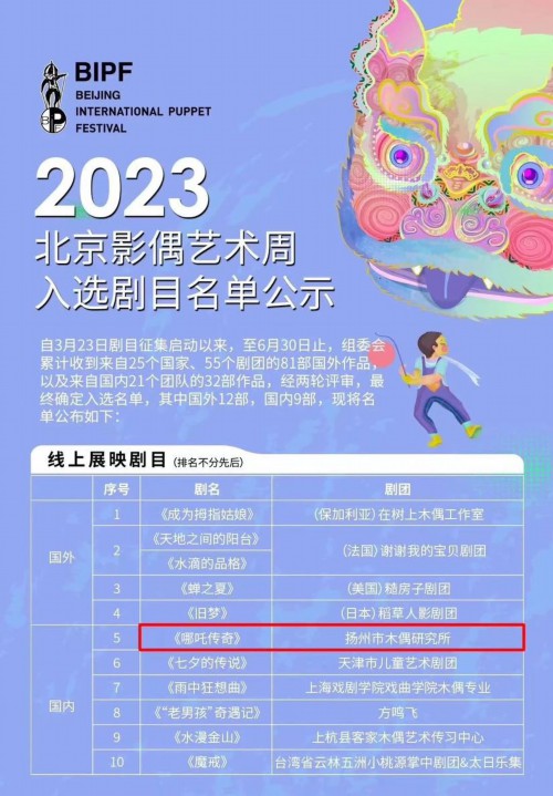 记者今获悉,由扬州市木偶研究所创作表演的大型神话木偶剧《哪吒传奇》入选第六届北京影偶艺术周线上展映剧目,成为国内6部入选剧目之一。