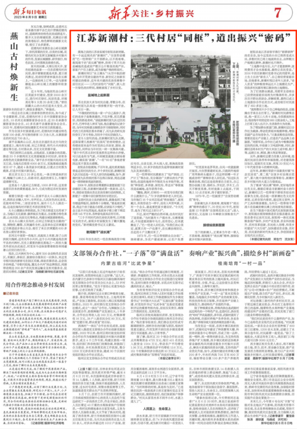 8月9日,新华社《新华每日电讯》,聚焦盐城射阳新潮村,三代村居“同框”,道出振兴“密码”。