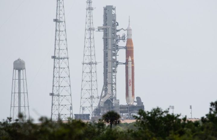 这是2022年4月2日在美国佛罗里达州肯尼迪航天中心拍摄的美国航天局新一代大推力运载火箭“太空发射系统”和安装在火箭顶端的“猎户座”飞船。新华社发(美国航天局供图)