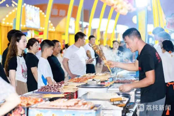 夜幕初降,射阳县黄沙港镇的泊心广场上灯光闪耀,人头攒动。渔档长街灯火璀璨、海味满满,各类冒着“鲜气”的美食令人垂涎欲滴。烤肉飘香,顾客盈门。人们纷纷慕名而来,品尝黄海鱼鲜,饱览渔港风光。