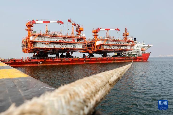 这是8月9日在天津滨海新区拍摄的渤中19-6凝析气田I期开发项目组块装船作业现场。组块装船后将赴渤海西部海域,进入海上安装和联调阶段。新华社发(杜鹏辉摄)