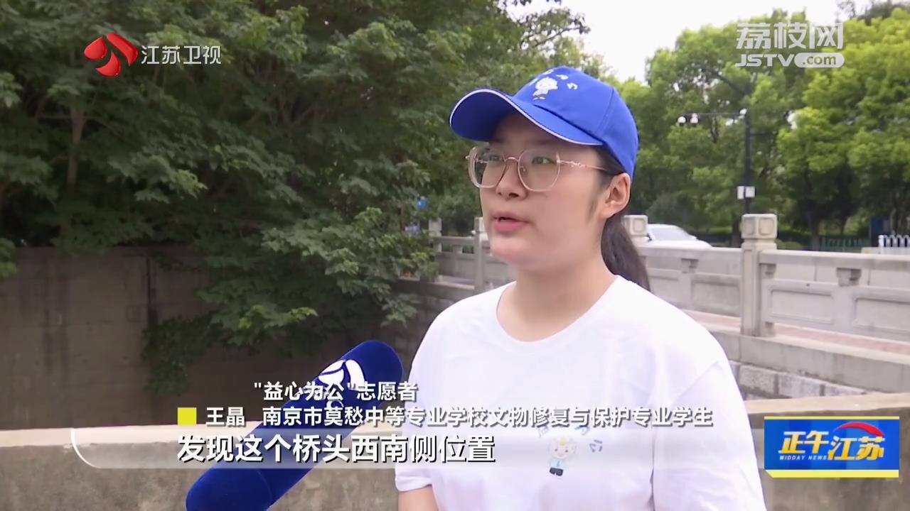 “益心为公”志愿者、南京市莫愁中等专业学校文物修复与保护专业学生王晶说:“发现这个桥头西南侧位置有一处违建的门岗,桥头存在大量商户堆积的一些杂物,会影响文物历史风貌,所以我们当时勘查到这个现场之后,我们立即拍照取证。”