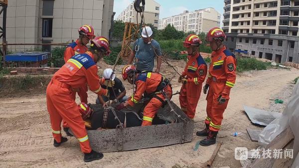 现场工地负责人协调一台吊车辅助救援,三名消防员做好防护措施带上救援工具到达男子被困位置后,立即询问男子身体状况,将男子固定在担架上并对男子做好保护措施。