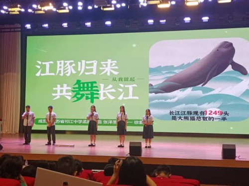 江豚,被称作是水中国宝。根据最新文献数据,通过不断努力,长江江豚数量已经恢复到1249头。如何持续加强对江豚保护?邗江中学领导力社团的同学们,以江豚保护为切口,进行了实践探究,相关项目亦获得特等奖。
