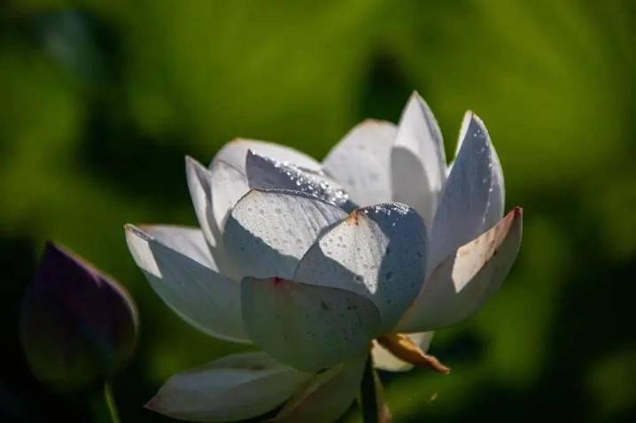 雨天在荷塘中的木栈道中漫步,看荷叶漫展开来,带着点点水珠,凉风吹来,枝叶上的水珠晃动,像是珍珠轻摇,泛着温润的光。荷花昂然挺立,带着点点水光,愈显娇艳,哪怕雨打风吹,仍然傲立水中,花美气节更美。