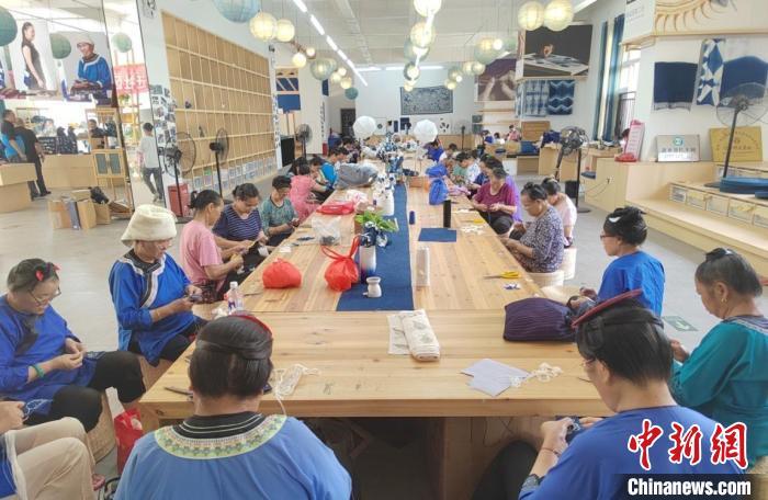在距“村超”球场不到2公里的易地搬迁点,有一个非遗手工坊,手工坊结合当地基础较好的蓝染、刺绣、手织布等非遗工艺进行建设,生产销售服饰、配饰、箱包、耳环等多种文创产品,备受游客青睐。