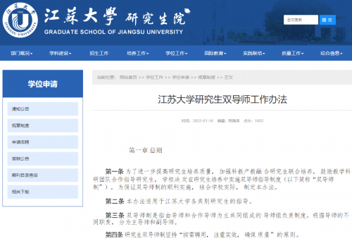 江苏大学研究生院则于去年1月发布了《江苏大学研究生双导师工作办法》,工作办法提出为了进一步提高研究生培养质量,加强科教产教融合研究生联合培养,鼓励教学科研团队合作指导研究生,专业学位研究生培养由校内指导教师(主导师)和校外实践指导教师(副导师)共同指导。在学校共建的联合培养基地中进行科教产教联合培养的研究生也由双导师共同指导。