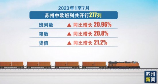 今年1至7月,苏州中欧班列共开行277列,班列数、箱数和货值同比分别增长 20.96%、 20.8%和 21.2% 。其中,苏州本地货源占比超过45%。