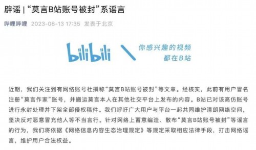 荔枝新闻讯 据哔哩哔哩微信公众号消息,B站13日在其官方微信号上发布公告表示,“莫言B站账号被封”系谣言。
