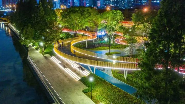 位于从城北大道至萧林路的张家港河南北两岸,廊道全长4.2公里,绿化景观面积约46万平方米。以“右岸补”(修补城市休闲活动空间),“左岸融”(将绿廊融入城市休闲网络)的方式,完善城市公共开放空间体系,恢复滨河空间绿色基底,区段内实现步行道与骑行道的贯通,打造自然“漫游”廊道。