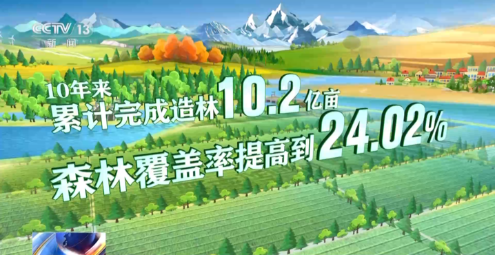 防沙治沙,离不开植树造林,我国扩绿的举措成效明显,10年来,累计完成造林10.2亿亩,森林覆盖率提高到24.02%。世界最大的生态工程——“三北”防护林,地跨西北、华北、东北13个省(区、市)和新疆生产建设兵团,经过不懈努力,在我国北方400多万平方公里的土地上筑起了一道绿色生态屏障。