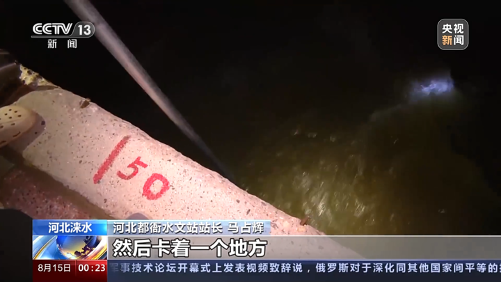 河北都衙水文站站长 马占辉:这流速太大,尽量往前探,顺着水势往下走,卡着一个地方,基本上就没问题。