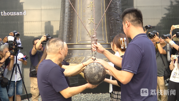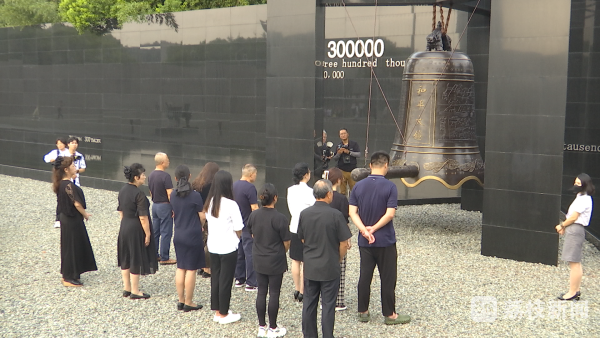 上午8点15分,撞响和平大钟仪式在侵华日军南京大屠杀遇难同胞纪念馆公祭广场举行。12名南京大屠杀幸存者后代分两批,撞响13 响和平大钟。钟声久久回荡在广场上空,时刻警示人们: 铭记历史记忆、守护历史真相。已故南京大屠杀幸存者王素明的女婿、第一批南京大屠杀历史记忆传承人夏天行:“中国人民经过了艰苦的抗战,终于取得了抗战的胜利,所以我们要珍惜来之不易的和平生活,要铭记这段历史,要让更多的人了解这段历史,我觉得参加这次活动的最大意义,就是再一次认识到千万千万不能忘记,侵华日军在南京犯下的滔天罪行,铭记历史、珍爱和平。”