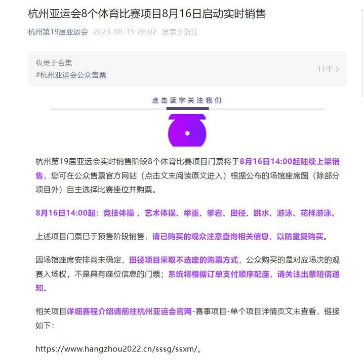 荔枝新闻讯 据“杭州第19届亚运会”微信公众号消息,杭州第19届亚运会实时销售阶段8个体育比赛项目门票将于8月16日14:00起陆续上架销售,可在公众售票官方网站根据公布的场馆座席图(除部分项目外)自主选择比赛座位并购票。