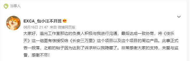 随后,原作者发文表示已与片方达成和解,将《伎乐天》这一组图有偿授权给《长安三万里》项目的周边产品。