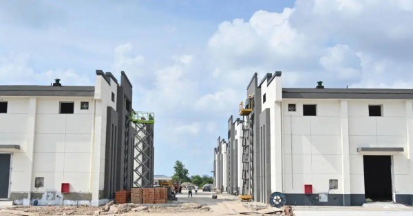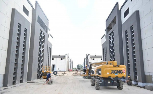 项目经理李建军介绍,项目于2021年1月动工,目前累计已完成投资1.3亿元,占全部工程投资1.6亿元的80%;检测中心、机械棚库、一站式服务中心、配电房等配套用房外墙真石漆及室内装修,以及1到5号仓室外管网及路面恢复、6到10号平房仓室内外饰面工程已基本完成;烘干房、制氮机房、配电房设备安装完成约90%,室外配套管网完成约20%,预计8月底竣工,9月底投产。