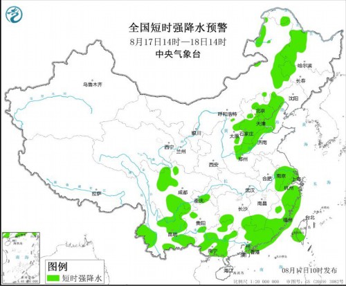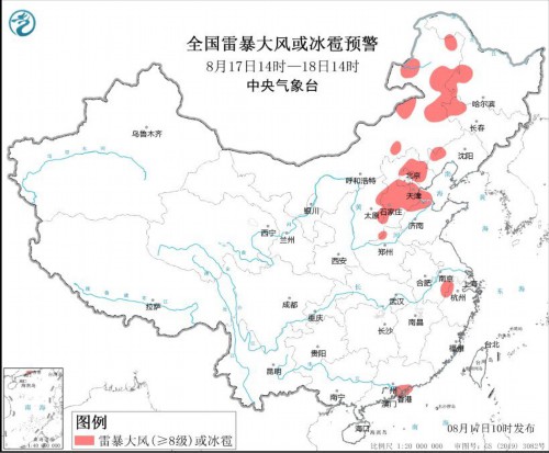 预计8月17日14时至18日14时,内蒙古中东部、黑龙江西南部、吉林西部、辽宁西部、山西中部、河北、北京、天津、山东北部、安徽南部等地的部分地区将有8-10级雷暴大风或冰雹天气;内蒙古东部、黑龙江中西部、吉林西部、辽宁西部、山西中东部、河北、北京东部和西南部、天津、山东北部、河南北部、安徽东南部、江苏中南部、上海、湖南南部、江西南部、浙江、福建、四川中部、重庆南部、贵州西部、云南、广西、广东中东部、台湾岛南部等地的部分地区将有短时强降水天气,小时雨量30-50毫米,局地可达60毫米以上。