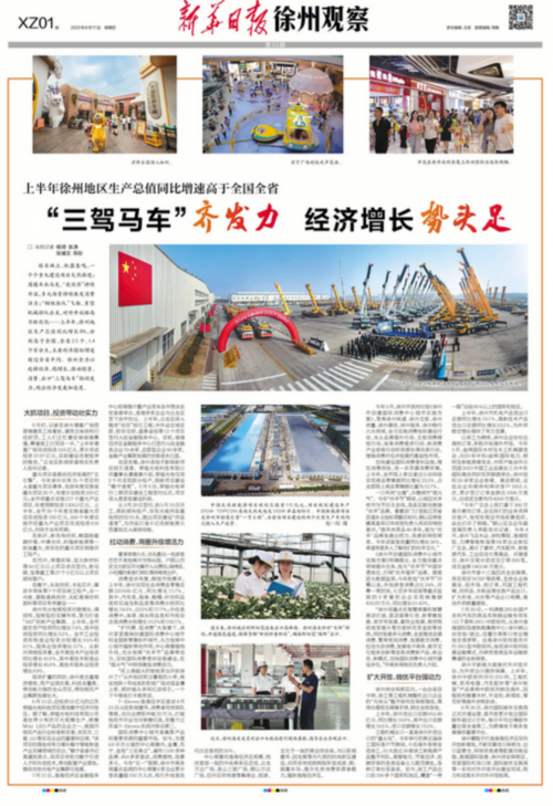 塔吊林立、机器轰鸣,一个个重大建设项目火热推进;商圈车水马龙、“夜经济”持续升温,多元场景持续激发消费活力;“钢铁驼队”飞驰、重型机械排队出关,对外开放格局不断优化……上半年,徐州地区生产总值同比增长8%,分别高于全国、全省2.5个、1.4个百分点,主要经济指标增速超过全省平均。徐州全力以赴拼经济、稳增长,推动投资、消费、出口“三驾马车”协同发力,跑出经济发展加速度。