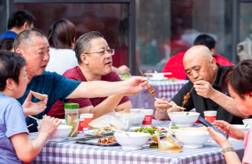 夏季夜晚9点,当天最后一批游客恋恋不舍地离开方特乐园。户部山历史文化街区月光集市人头攒动,烧烤店、小吃摊的食客们排队等待宵夜出炉。