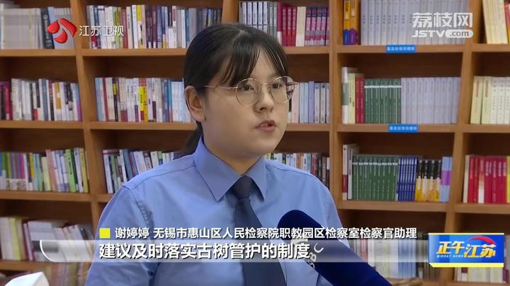 无锡市惠山区人民检察院职教园区检察室检察官助理谢婷婷说:“我们向惠山区城管局发出诉前检察建议,建议及时落实古树管护的制度来抢救复壮濒危的一些古树,切实来加强古树名木的养护和管理。”