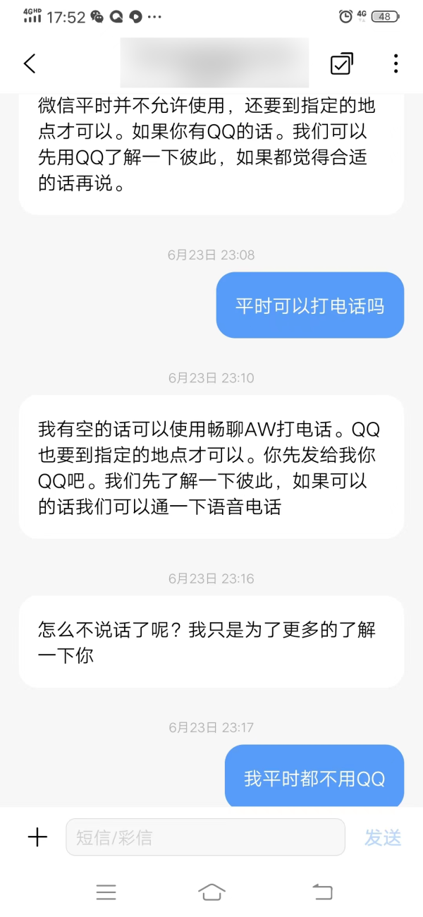 事情还要回溯到6月下旬的一天,郭女士收到一条短信,对方声称在国内某相亲网站上看到了她的个人信息及联系方式。在随后的交谈中,郭女士了解到男子姓方,目前在某军区上班,还有一个多月就要转业到镇江政府部门工作。男子还明确向郭女士表示:“想找个合适的人一起共度余生。”郭女士有意深入了解对方,方姓男子却以“部队不让用微信”为由,拒绝了郭女士加微信的请求,转而让她下载了一款名为“畅聊AW”的聊天软件。在了解到郭女士尚有债务在身的情况下,方姓男子以此为契机提出自己有办法让郭女士赚点钱早点把债务还掉。“爱情”与“面包”同时来到自己身边,郭女士喜不自禁,按照方姓男子的要求,提供了自己名下的几个银行账户给对方。