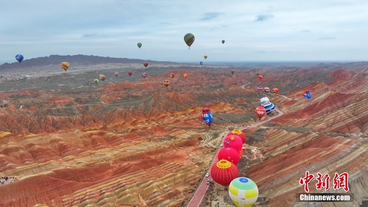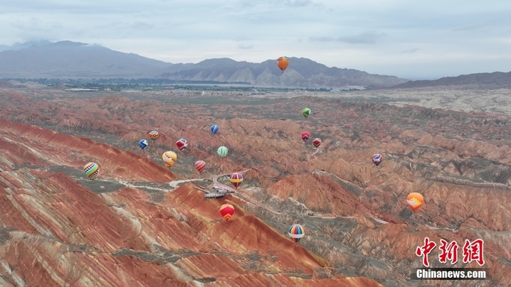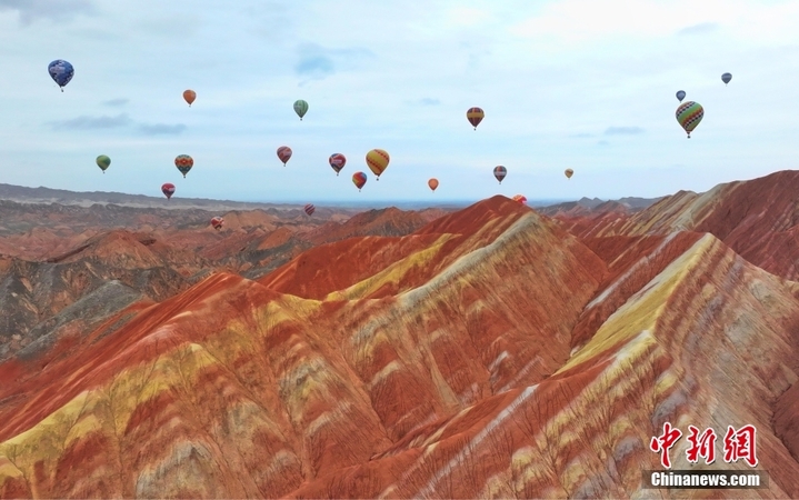 8月16日,来自全国各地的40名热气球运动员驾乘40具热气球,在七彩丹霞上空进行集中飞行表演,从七彩丹霞景区热气球起降点起飞,飞跃整个景区,上演热气球与七彩丹霞的唯美邂逅。图/CNSphoto 王超 摄